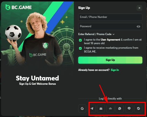 Registration in BC.Game Philippines takes 2-5 minutes. All standard options are available: via a Google account, email, phone number, and social networks.